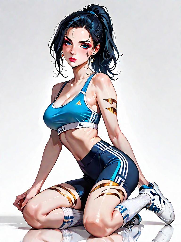 1girl, source_comics, realistic face, full body shot, Woman, athletic wear, navy blue sports bra, scoop neckline, racerback, gold accent panels, matching high-waisted compression shorts, gold side stripes, white crew socks, white sneakers, hair in a ponytail, white studio background