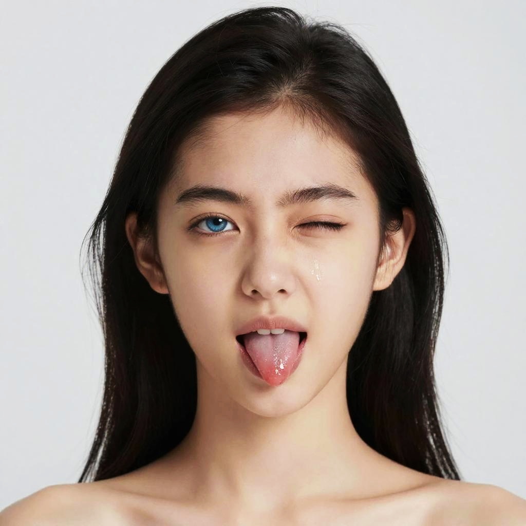Hyperrealistic art, high angle contact of amateur photo of a woman, ahegao, rolling eyes, tongue, tongue out, drool, licking ice, cone, 43 years old, interested, foundation, Dazzling, pencil eyeliner, velvet lipstick, over exposed, Contoured cheeks, Full eyelids, French braid hair cut, Saffron-colored hair, light skin color, golden hour lighting, soft focus, detailed skin, skin blemish, photographic, realism pushed to extreme, fine texture, incredibly lifelike