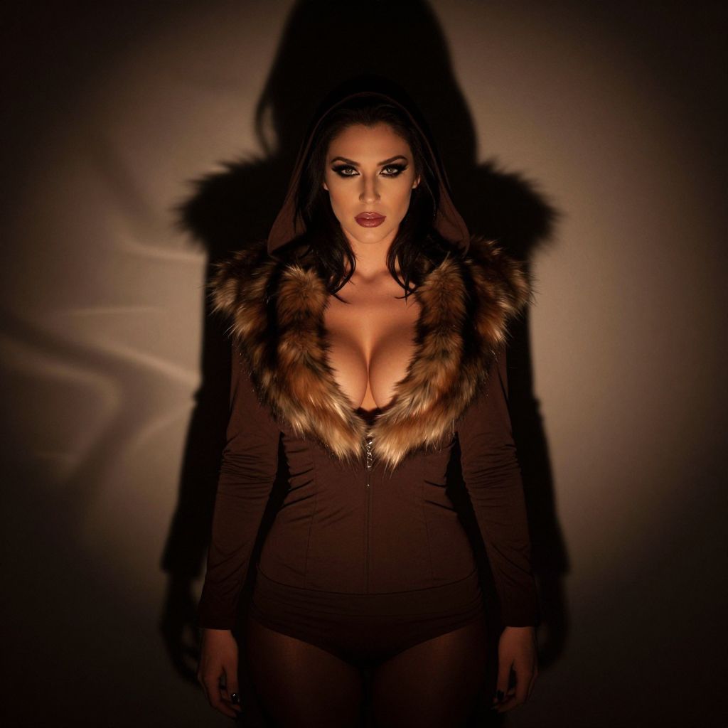Photograph of a woman with dark, wavy hair and dramatic makeup, standing against a dark, shadowy background. She wears a brown, long-sleeved, deep V-neck bodysuit with a fur collar and zip-up front, accentuating her large breasts. Her piercing blue eyes and bold red lipstick contrast with her dark attire. The lighting casts a strong shadow behind her, adding a dramatic effect. The texture of the fur collar is soft and fluffy, while the bodysuit is smooth and fitted. The overall style is dark, edgy, and sensual.