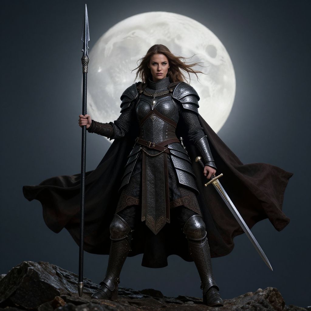 A fierce woman warrior stands on rocky terrain under a luminous full moon, clad in intricate medieval armor with flowing hair and a dramatic cape. She wields a large spear in one hand and a sword in the other, embodying strength and readiness in a dark, fantasy-inspired setting.