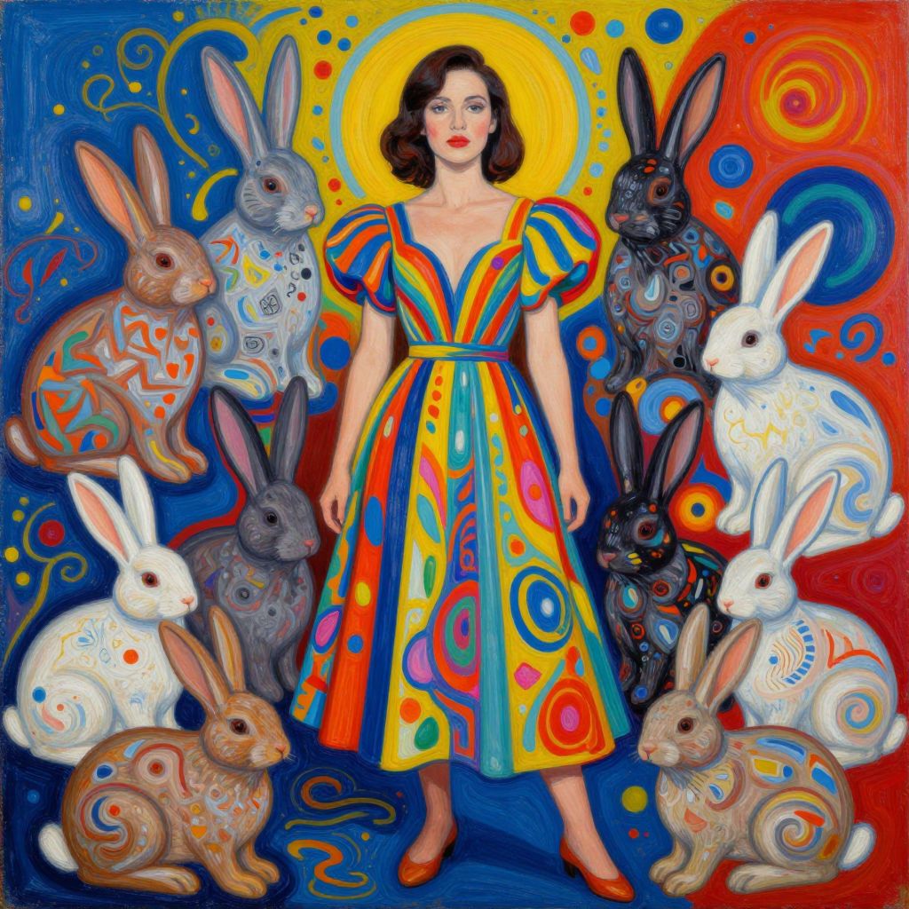 This vibrant digital painting features a fair-skinned woman with dark, wavy hair, wearing a colorful, 1950s-style dress with puffed sleeves and a V-neck. She stands centered against a vivid, swirling background of blue, red, yellow, and orange. Surrounding her are seven stylized rabbits, each adorned with intricate, colorful patterns, including swirls, circles, and geometric shapes. The rabbits vary in color: white, brown, and black. The woman's dress matches the bold, abstract patterns of the rabbits. The background is filled with dynamic, swirling lines and dots, enhancing the overall psychedelic, surreal aesthetic.