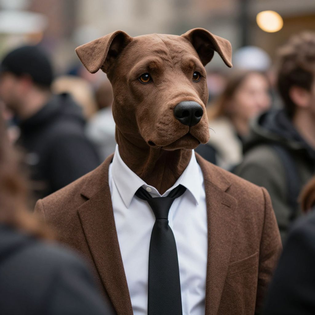 Photograph of a brown dog with a serious expression, wearing a brown tweed suit, white dress shirt, and black tie. The dog's ears are perked up, and its dark brown eyes look slightly to the side. The background is blurred, showing a crowd of people in dark winter clothing, with some lights in the distance. The dog stands out prominently against the softer, out-of-focus crowd, creating a surreal urban street scene. The overall mood is both humorous and unexpected.