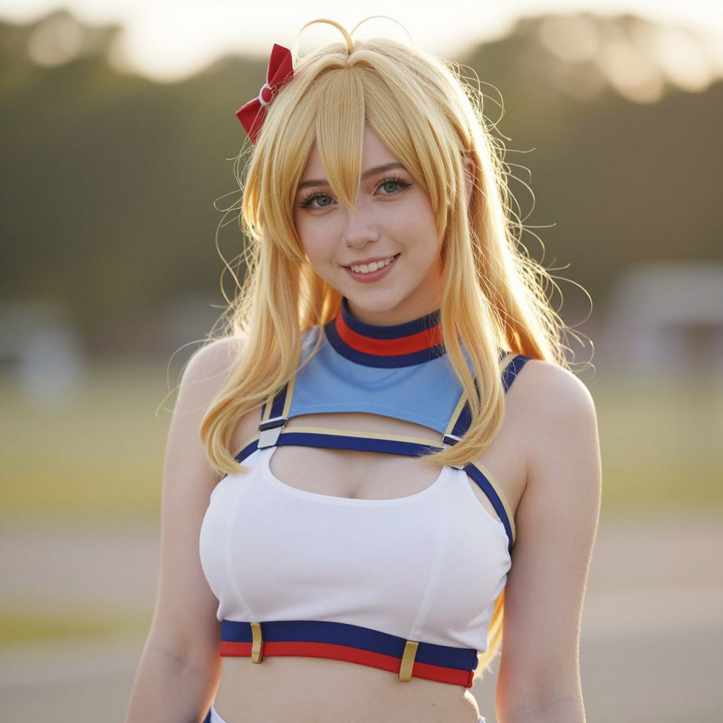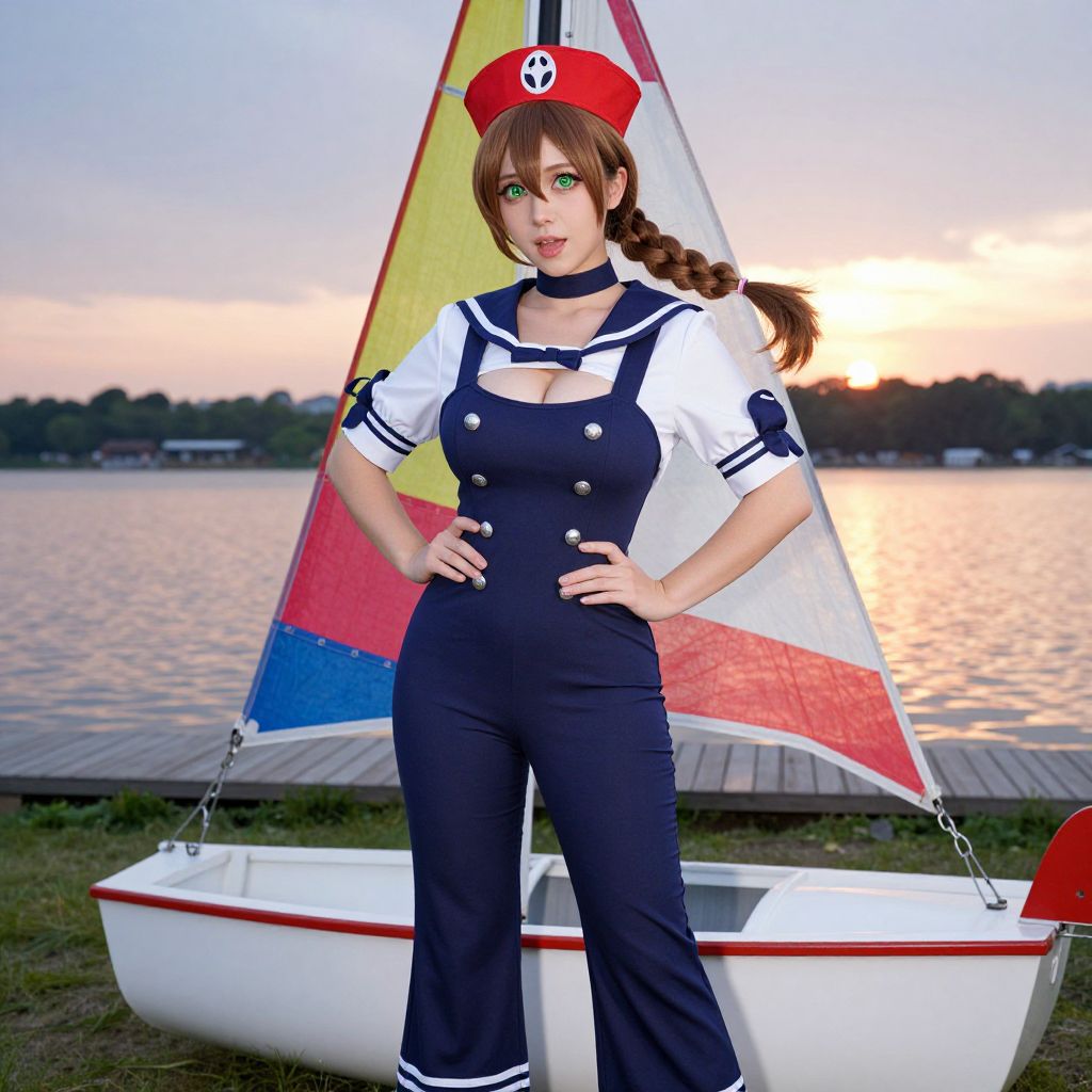 A well-lit, outdoor nautical themed party with a woman in a custom costume featuring a sailor's jacket with silver buttons, a red sailor cap, and wide legs of a navy pantsuit. She has large green eyes, light brown hair tied in a braid, and a playful expression, standing near a colorful sailboat on a lakeside dock with a sunset sky in the background.. The woman has big breasts and cute face