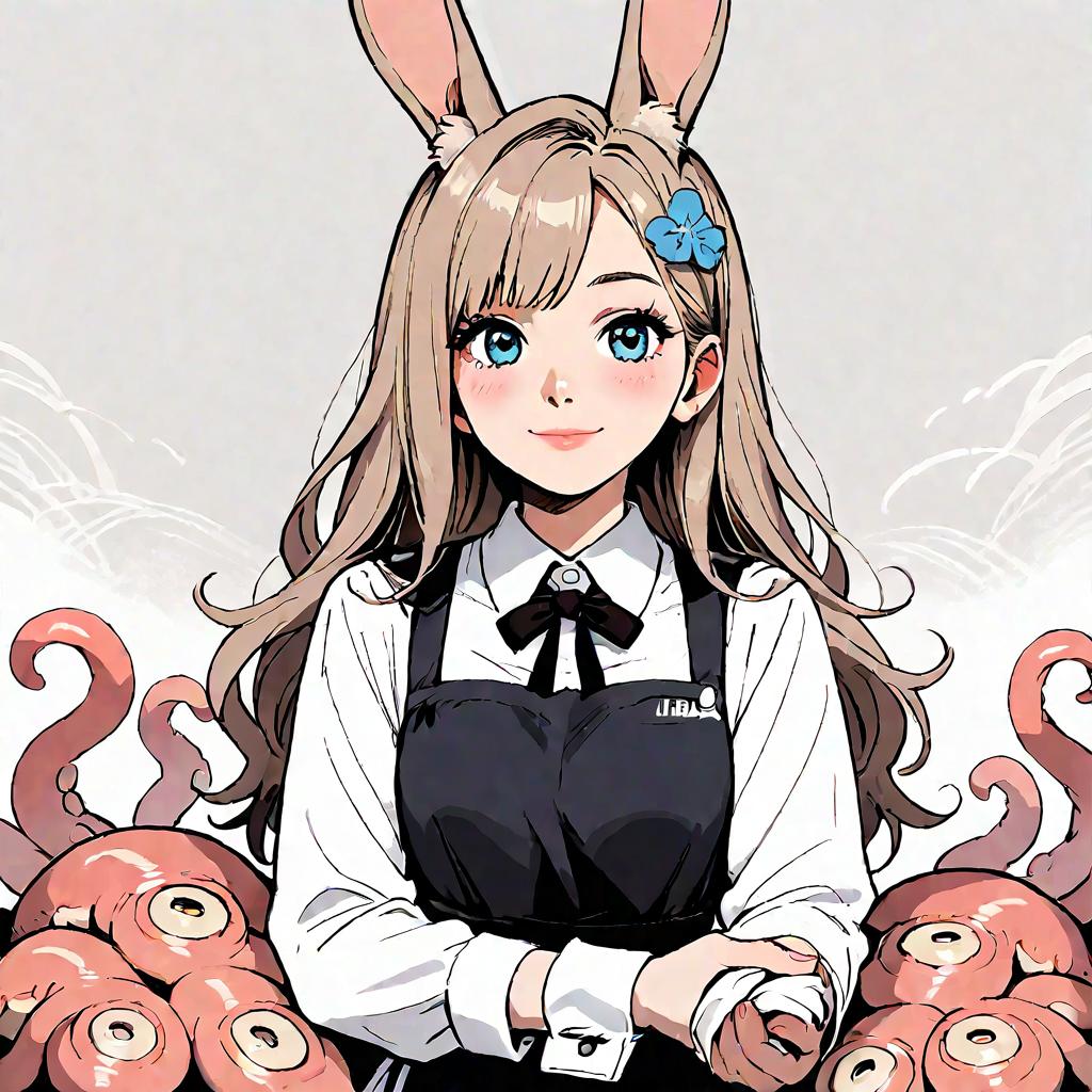 Score_9, source_anime, by akai sashimi, best quality, masterpiece, uncensored1girl, animal ears, apron, black apron, black bow, blue eyes, border, bow, closed mouth, collared shirt, hair ornament, holding, light brown hair, long hair, long sleeves, looking at viewer, muted color, newspaper, octopus, rabbit ears, shirt, sleeve cuffs, smile, solo, tareme, tentacles, upper body