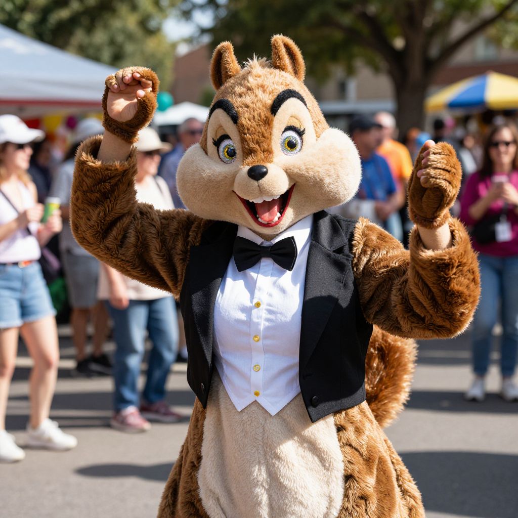 A hilarious costume woman dressed as a dancing squirrel wearing a tiny tuxedo and bowtie, performing a clumsy yet hilarious jive at a neighborhood street festival, bright sunlight, her face lively and mischievous, detailed facial expression with sparkly eyes and a wide grin, realistic scene.. The woman has big tits and cute face