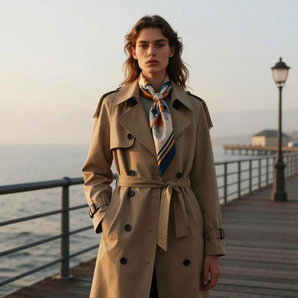 Long Fringe hairstyle on androgynous model, wearing tailored trench coat, in neon-lit alley, captured in fashion editorial style with neon rim light with moody fog.