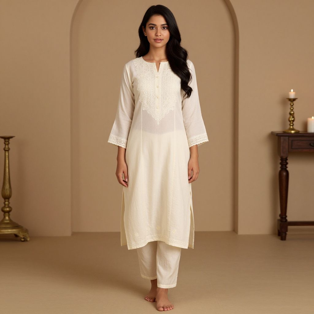 Party wear kurti costume, 1girl, solo, candle, black hair, indoors, long hair, standing, candlestand, full body, looking at viewer, realistic, barefoot