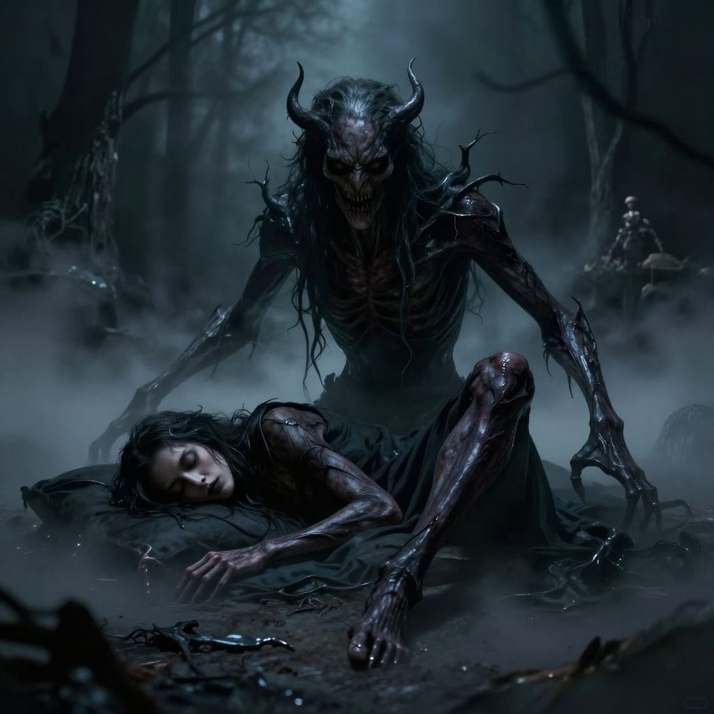 Sleep paralysis demon images featuring a haunting creature emerging from the darkness, with elongated limbs and a menacing posture, surrounded by fog and an unsettling vibe