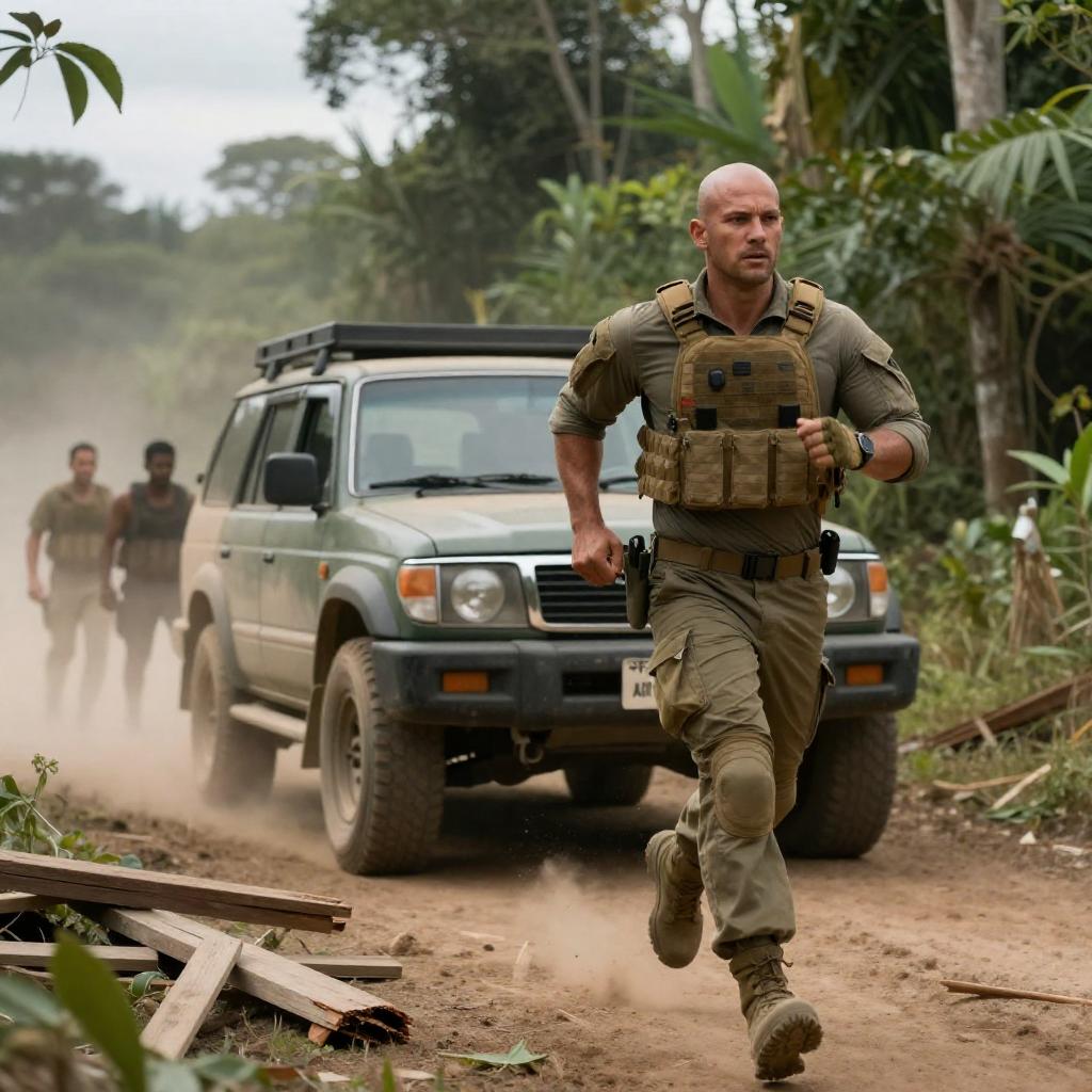 A bald, muscular man in tactical gear crouches beside a heavily armored, black SUV, holding a rifle. The SUV has multiple mounted lights and equipment. The background is a barren, dusty landscape. The man's focused expression contrasts with the vehicle's rugged, ured surface.