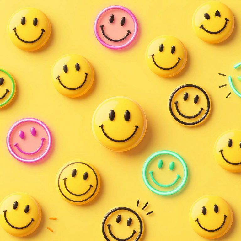 Pictures of smiley faces, vibrant and playful, scattered across a sunny yellow background, various styles including classic, neon, and hand-drawn, whimsical and joyful atmosphere, soft shadows and a slight 3D effect, digital art style