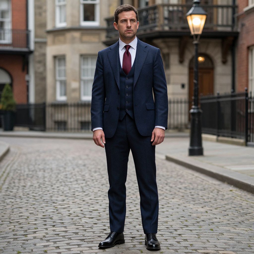 A man, navy wool three-piece suit, crisp white dress shirt, silk burgundy tie, polished black leather oxford shoes, tailored fit, cobblestone streets, Victorian architecture, gas lamps glowing, camera obscura style, contemplative expression. Man has masculine face and piercing eyes
