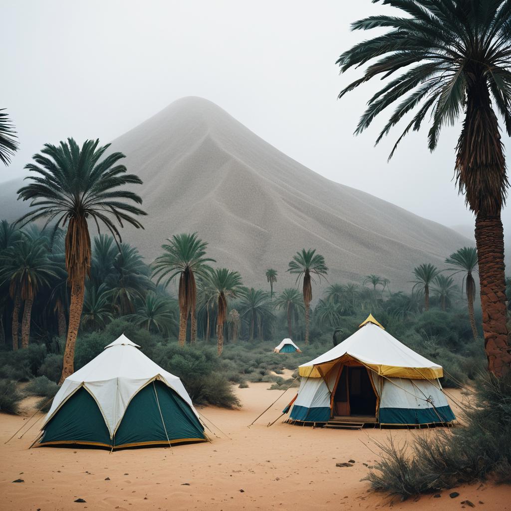 A serene desert camping scene featuring a large white and green tent alongside a smaller blue tent set among palm trees and desert vegetation. In the background, a towering sand dune looms with mist gently settling over lush green forested areas. The contrast between the sandy terrain and verdant foliage creates a unique tropical desert atmosphere.