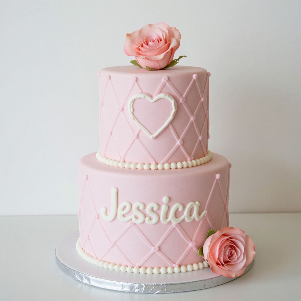 Two-tiered pastel pink nappy cake featuring intricate crisscross icing patterns, adorned with a delicate pink rose atop the upper tier, a heart-shaped embellishment, and the name \"Jessica\" elegantly written in white fondant on the lower tier, complemented by a matching rose at its base.