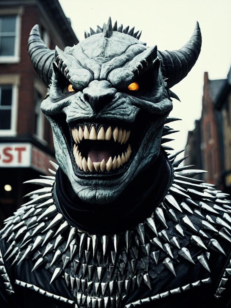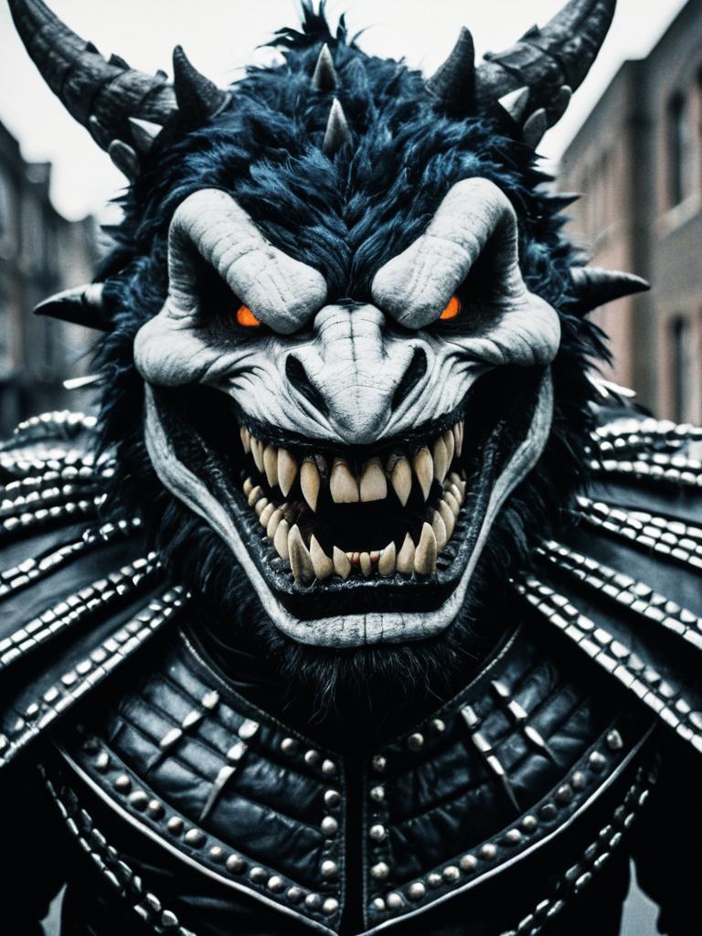 Man in Beast Teeth Costume, waist-up editorial portrait, photorealistic detail