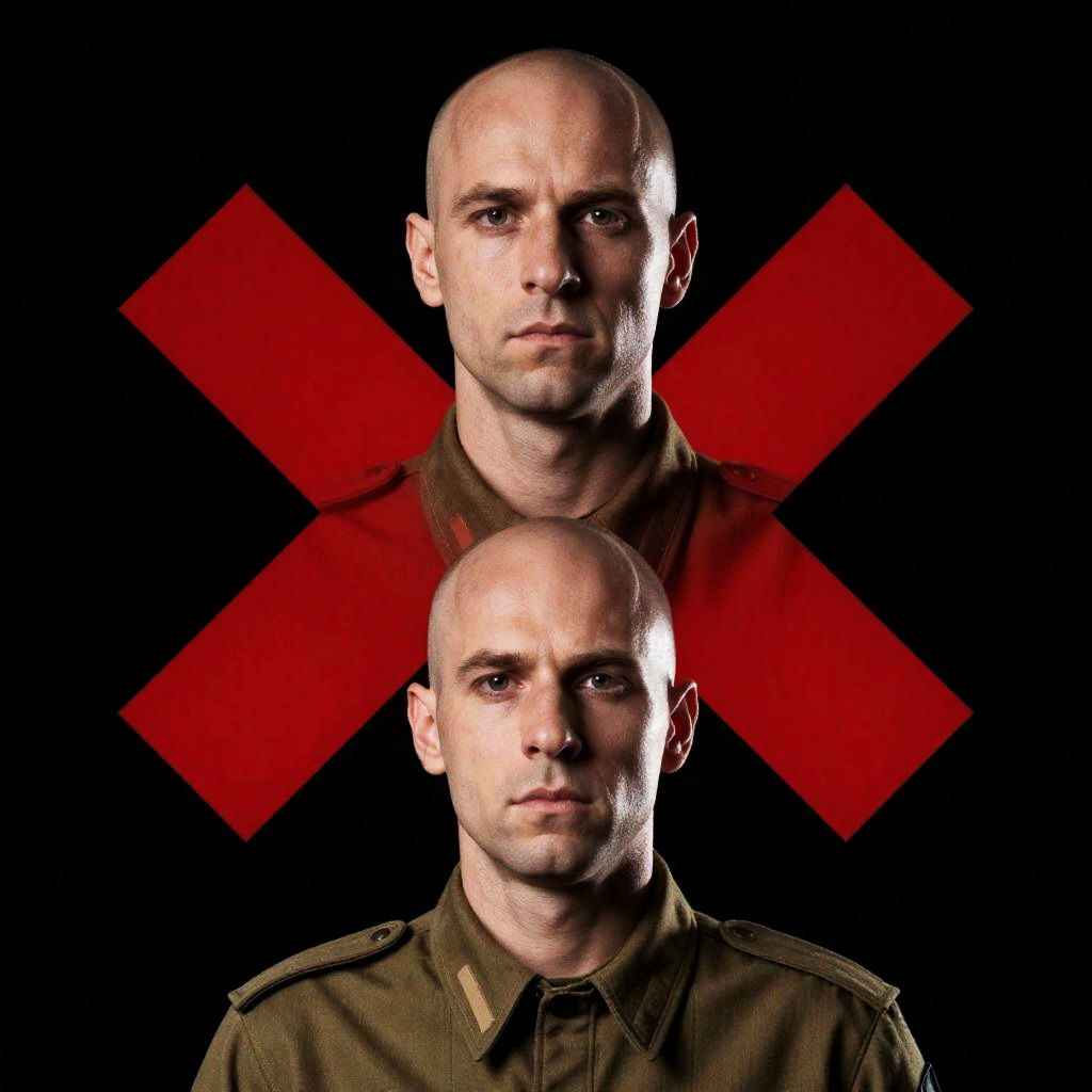 Photograph of two men with bald heads, in military uniforms, positioned within a large red swastika on a black background. Top man with serious expression, bottom man with neutral expression. Swastika overlays their heads, contrasting sharply.