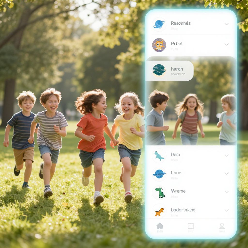 AI prompts for kids photography: A sunny park scene with children running and laughing, captured in a photo with a glowing AI interface in the corner showing real-time prompt suggestions tailored to young children's interests like animals, planets, and dinosaurs.