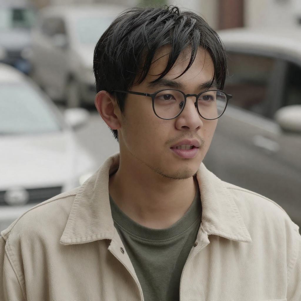 Photograph of a young man with curly dark hair, wearing a brown jacket, holding a vintage camera to his face, smiling. Blurred person in white shirt in foreground. Green trees in background. Sunlight. Casual outdoor setting.