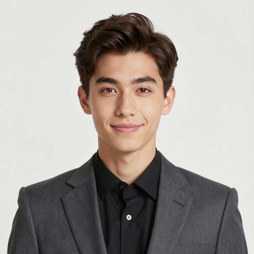 Photograph of a smiling teenage boy with short dark hair, wearing a white t-shirt, arms raised behind his head, against an orange background.