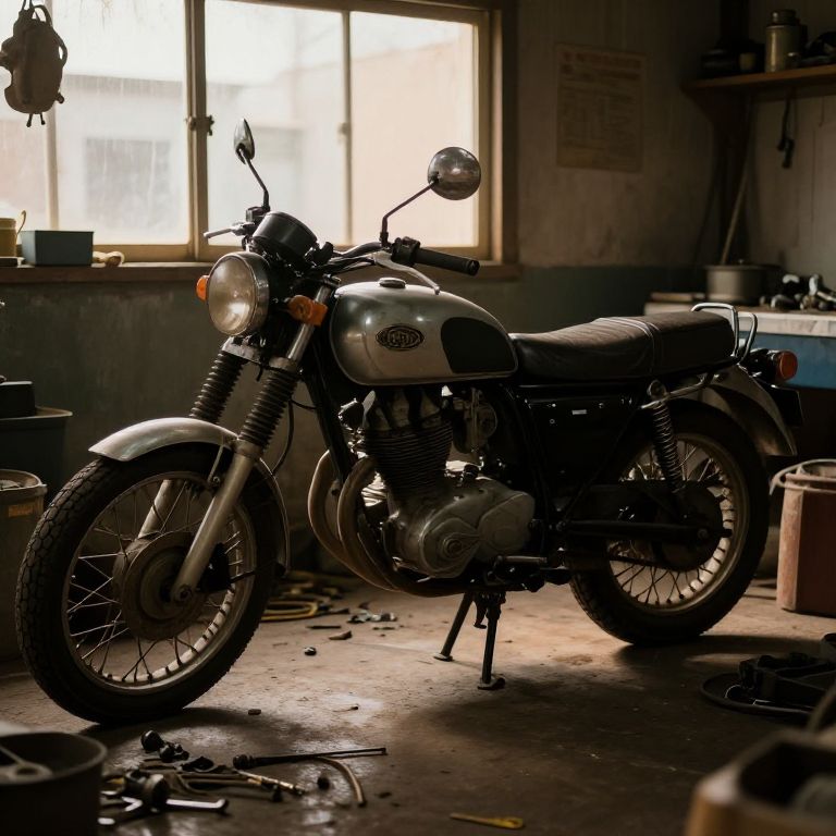Repairing a vintage motorcycle in a cluttered garage, mechanical parts scattered around, warm ambient light filtering through dusty windows, realistic metal textures, nostalgic atmosphere