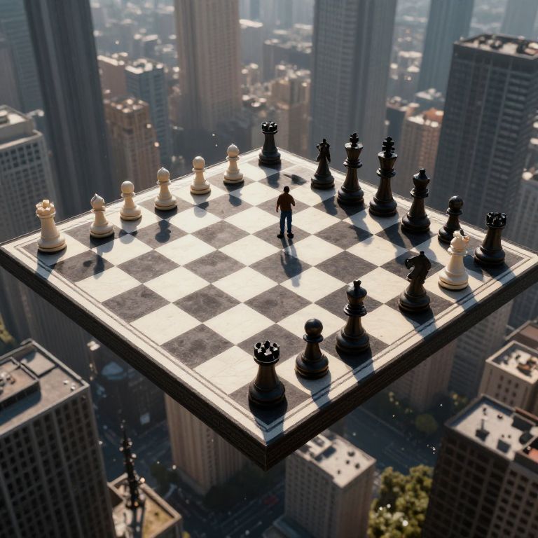 Photorealistic CGI: Floating chessboard with black and white pieces, hovering above a cityscape of tall skyscrapers, with sunlight casting dramatic shadows