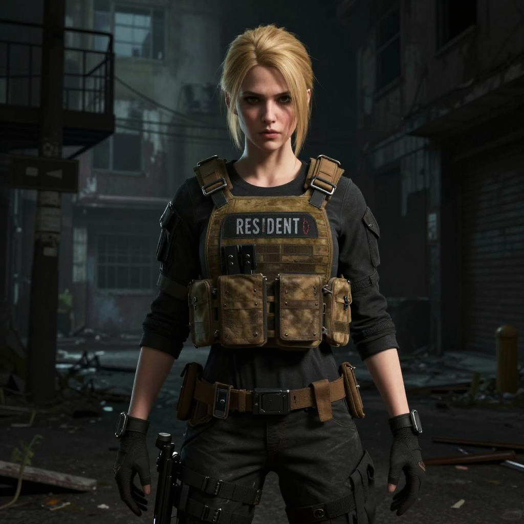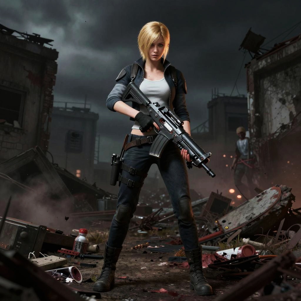 Blonde girl from Resident Evil, wielding a futuristic weapon, amidst a zombie outbreak, ruins surrounding her, moody shadows, post-apocalyptic setting, hyper-realistic style, digital art
