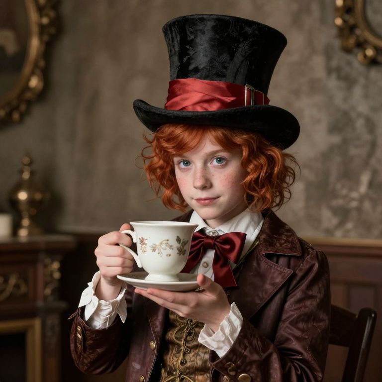 Mad Hatter Boy, young girl with red hair wearing a top hat and holding a cup