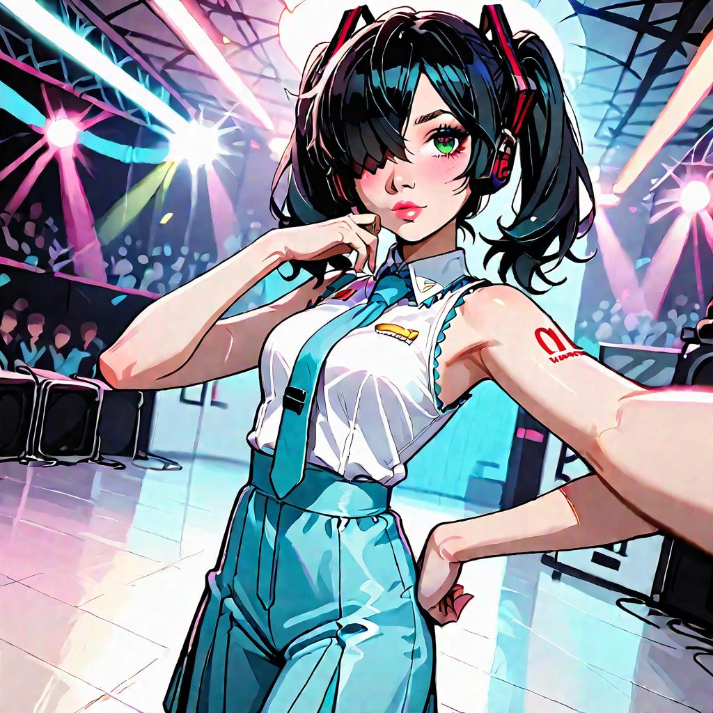 Score_4, score_5, score_6, score_9, score_8_up, score_7_up, source_anime, anime_screencap, tomokoxl, bags under eyes, black hair, medium hair, hair over one eye, hatsune miku \(cosplay\), stage, stage lights, thighhigh, pov, selfie, hand on own hip, indoors