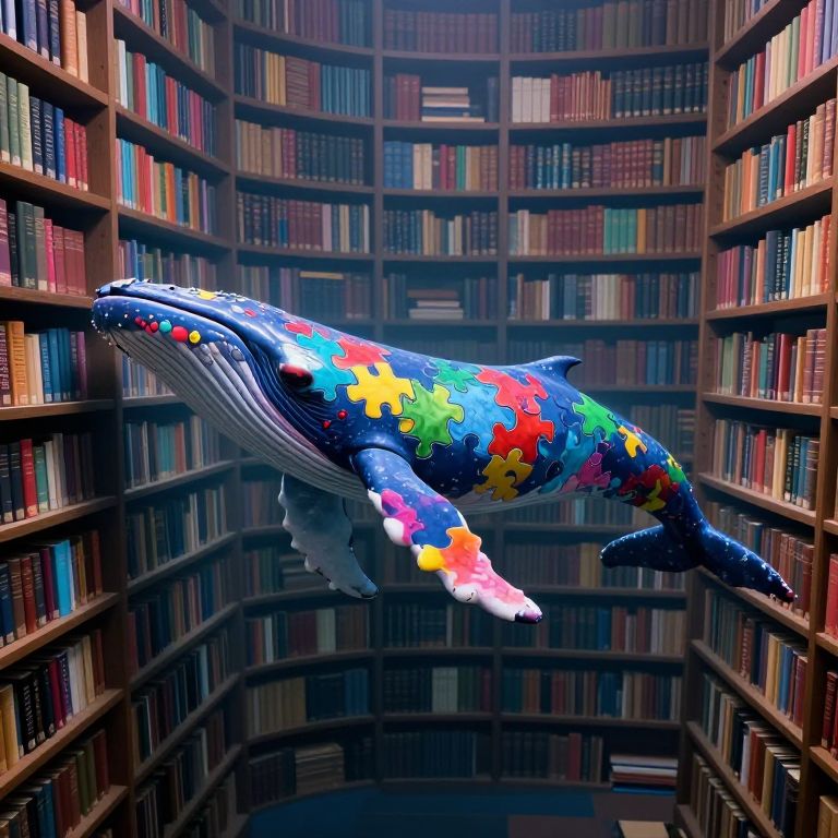 A technicolor whale drifts serenely through an endless library, its body adorned with vibrant, puzzle-like patterns that seem to merge seamlessly with the surrounding shelves of books, creating a surreal fusion of marine wonder and literary magic.