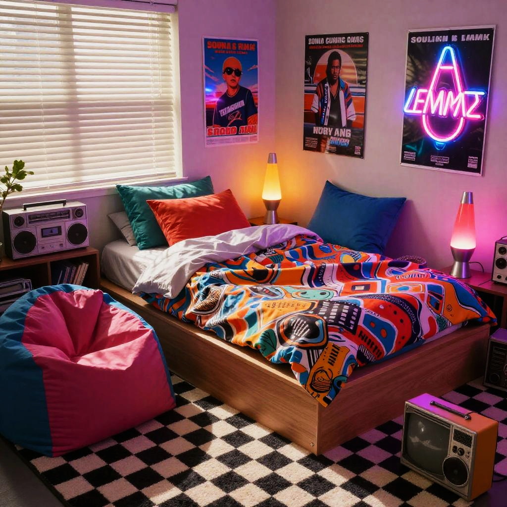 90s style bedroom with neon posters on walls, vintage cassette player, colorful bean bags, lava lamp glowing softly, platform bed with patterned comforter, checkerboard carpet, retro gadgets scattered around, sunlight filtering through blinds, cozy nostalgic atmosphere
