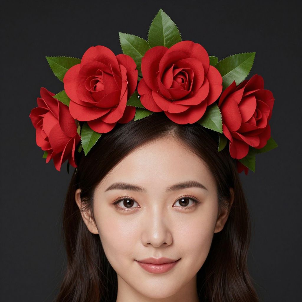 Elegant red rose paper headdress crown adorns a woman's head, featuring four vibrant blooms and lush green leaves, creating a striking floral accessory against her dark hair and soft smile.