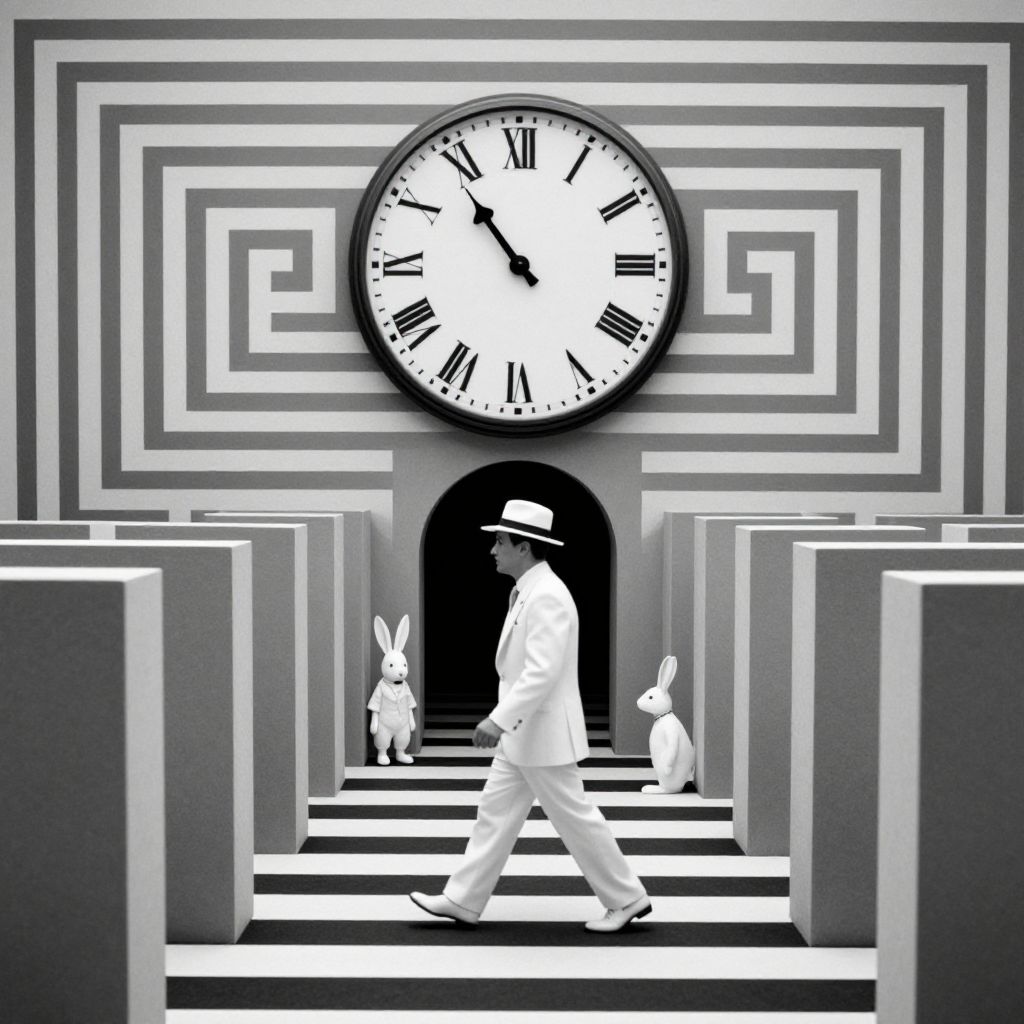 In this surreal, monochromatic scene, a man dressed in a white suit and hat, reminiscent of Jacques Tati, strides confidently through a labyrinthine maze. The maze walls are composed of repetitive, geometric patterns, creating an optical illusion of depth and perspective. A giant, round clock with Roman numerals hangs prominently on the wall, its hands frozen in time. A white rabbit, also dressed in white, stands near the entrance, adding to the whimsical atmosphere. The floor is striped with alternating black and white lines, enhancing the sense of movement and direction. The overall composition, with its precise alignment and interplay of shapes, textures, and colors, evokes a sense of both order and mystery, capturing the essence of a dreamlike, Leica monochrom-style surrealism.
