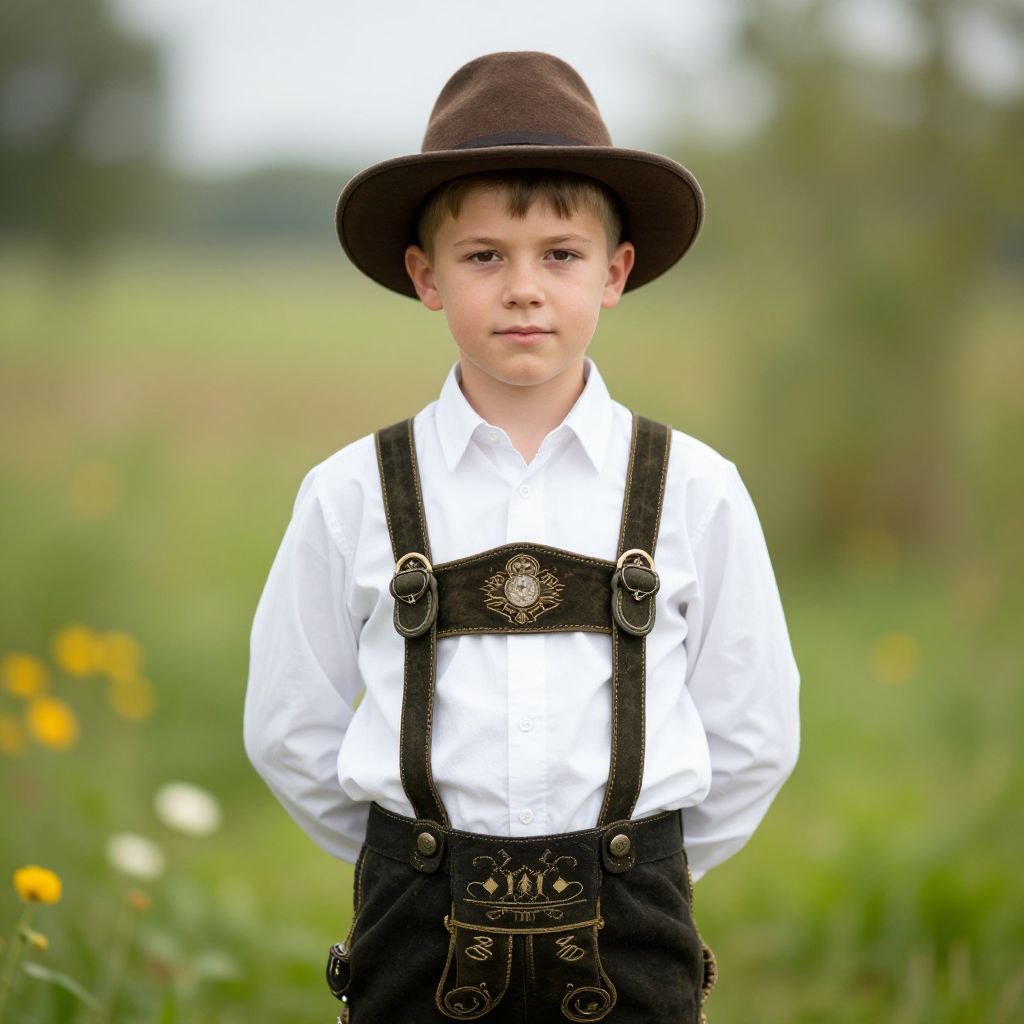 Photograph of a young boy standing in a grassy field with blurred greenery and yellow flowers in the background. He has fair skin, brown eyes, and short brown hair. He wears a black felt hat, a white long-sleeved shirt, and black leather suspenders with intricate gold and brown detailing. His black pants have a brown leather belt with ornate buckles. The boy's expression is neutral, and he stands with his hands behind his back. The overall style is traditional, with a slightly vintage feel. The lighting is natural, highlighting the bright white of his shirt and the rich colors of his clothing.