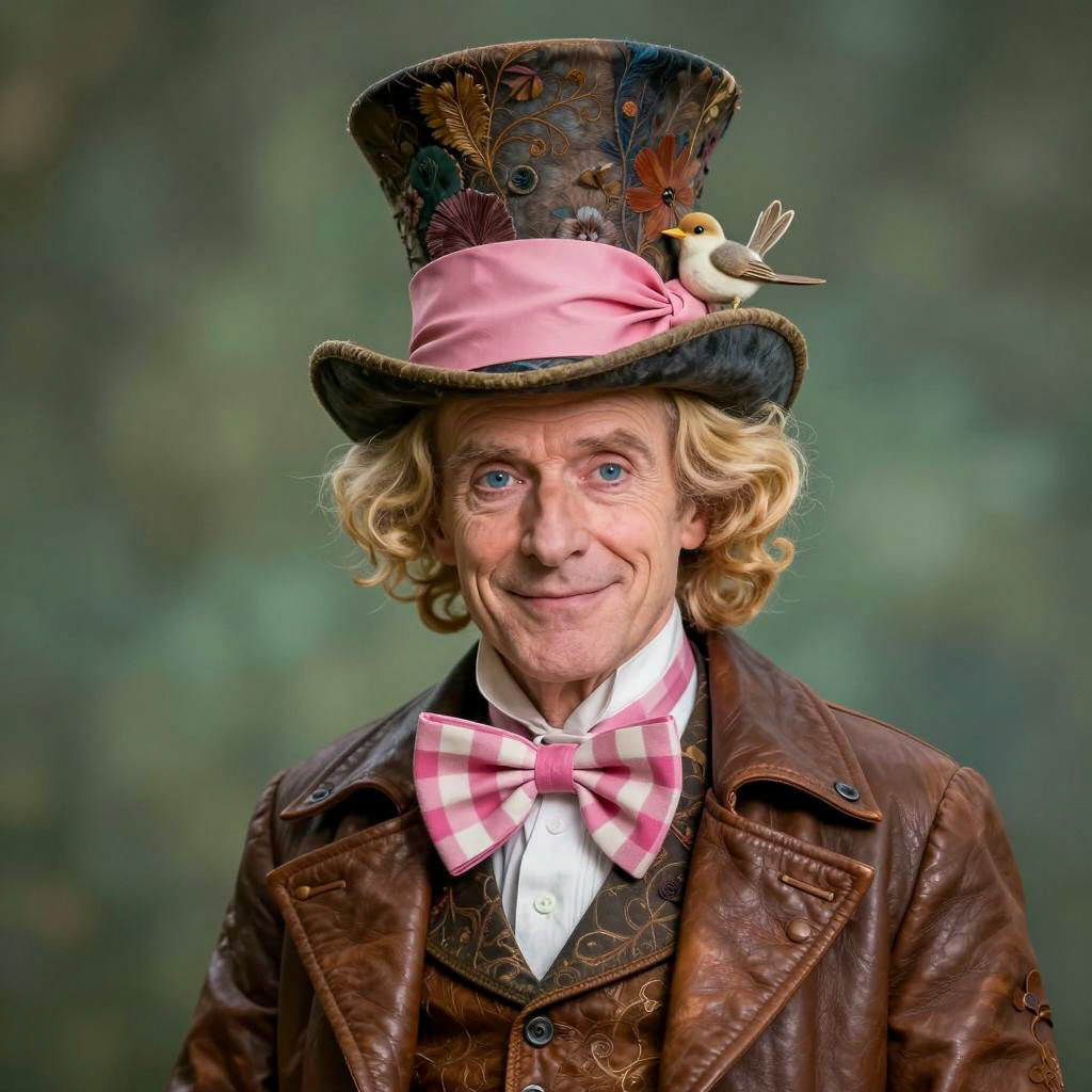 Detailed portrait of an older white man with wavy blonde hair dressed as the Mad Hatter from Alice in Wonderland. He wears an ornate tall top hat decorated with floral patterns, a pink ribbon, and a small bird figure. His outfit includes a brown leather coat, a patterned vest, a white shirt, and a pink and white plaid bowtie. The background is green and softly blurred, highlighting the whimsical and colorful style of the character with a slight smile and blue eyes.