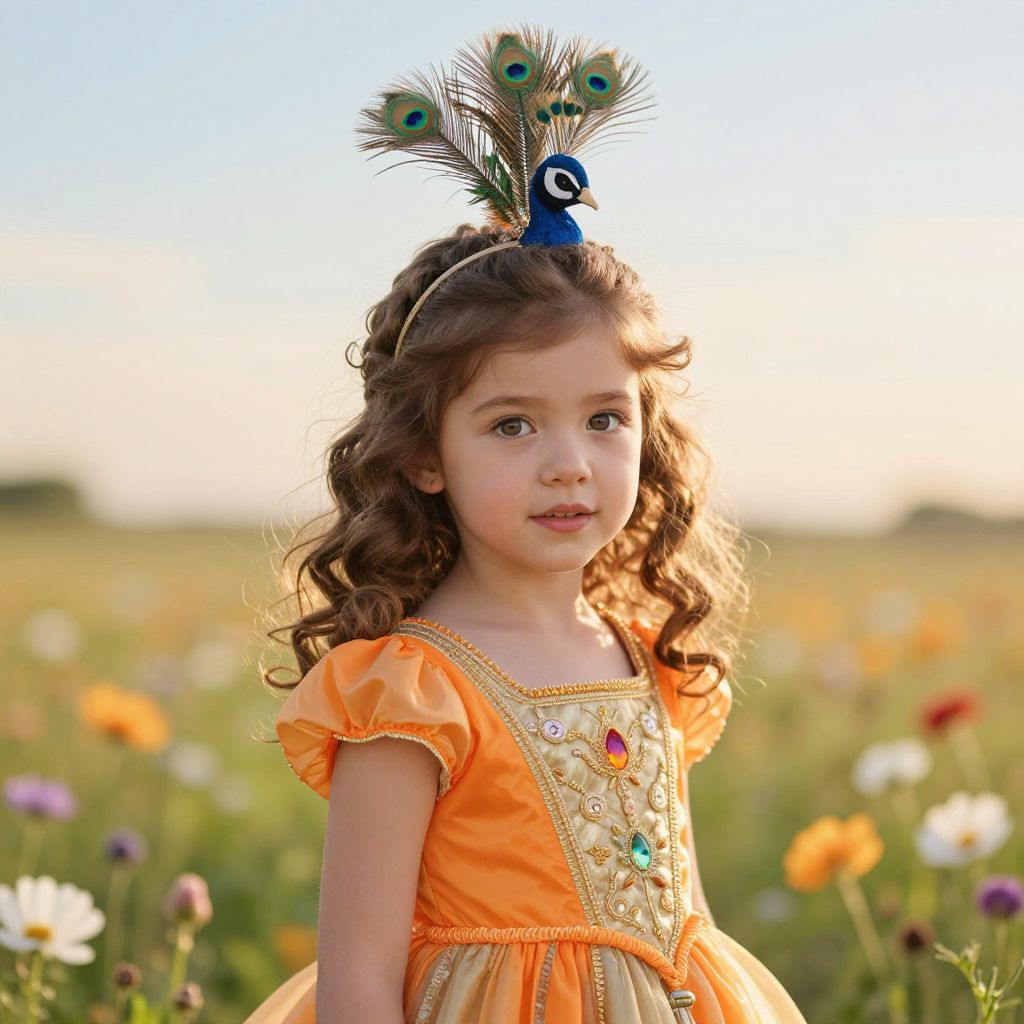 A young girl with bright, curious eyes and curly brown hair stands in a sun-dappled meadow, wearing an elegant orange and gold dress with intricate embroidery. She wears a delicate peacock headpiece adorned with shimmering feathers that catch the sunlight, giving her a magical and vibrant appearance. The background features blooming flowers and a soft gradient sky, enhancing the whimsical and joyful atmosphere.