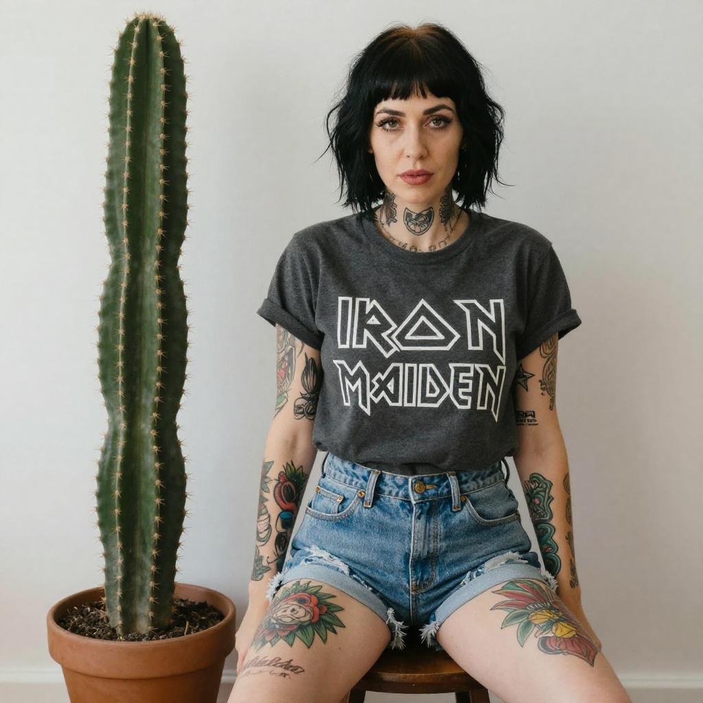 Photograph of a tattooed woman with short black hair, sitting against a white wall. She wears a dark gray "Iron Maiden" t-shirt and denim shorts, showcasing colorful tattoos on her arms, legs, and thighs. A tall green cactus in a brown pot is to her left. She gazes directly at the camera with a neutral expression.