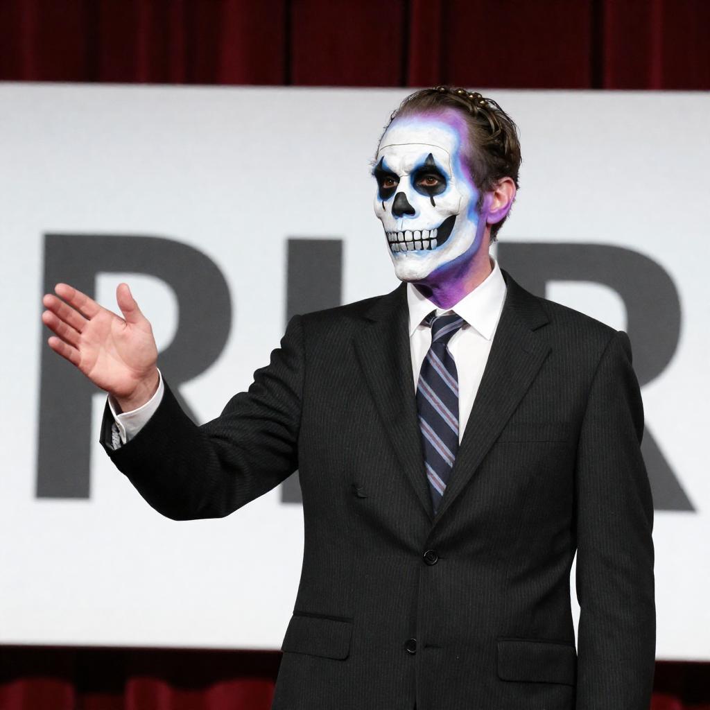Photograph of a man with a skeletal face, blue and purple painted skin, wearing a black pinstripe suit, white shirt, and striped tie. He gestures with his right hand, standing in front of a large white screen with bold black letters. Red curtains are in the background. A microphone is positioned in front of him.