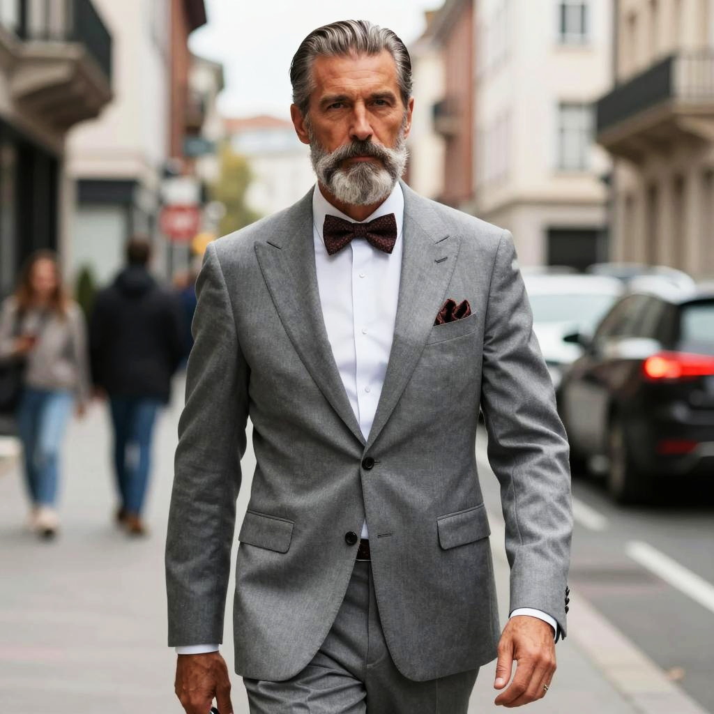 A distinguished man with a neatly groomed gray beard and slicked-back hair stands confidently on a city street. He is dressed in a tailored gray suit with a patterned bow tie and matching pocket square, exuding timeless elegance and style.