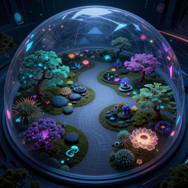 A mesmerizing digital artwork encapsulates an ethereal Zen garden bathed in celestial bioluminescent flora, viewed from above through the crystalline dome of a futuristic space habitat. This imaginative piece seamlessly marries traditional Japanese aesthetics with visionary sci-fi design, evoking a spectrum of emotions ranging from tranquil reflection to profound amazement. The composition is accentuated by vibrant neon hues and intricate geometric patterns, symbolizing the harmonious blend between nature's splendor and advanced technology in this innovative hybrid of artistry and ingenuity.