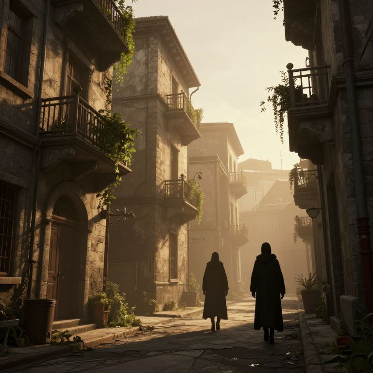 An atmospheric 3D-rendered scene depicts a desolate urban alley bathed in golden-hour light, where weathered stone buildings stand as silent witnesses to history, their balconies adorned with creeping greenery, while two cloaked figures walk through the haze, evoking a hauntingly cinematic mood reminiscent of dystopian cyberpunk aesthetics.