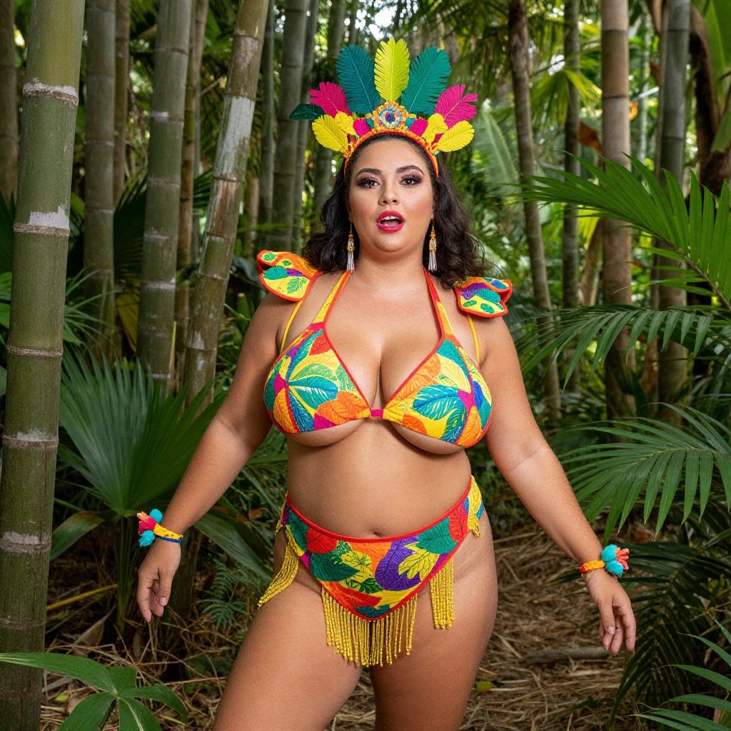 A vibrant, natural photography scene of a confident plus-size woman in an adult costume with large, voluminous breasts, wearing a bold, colorful themed outfit inspired by a jungle festival, standing in a tropical jungle set with bamboo trees and vibrant greenery, her face showing pride and energy, with deep earth tones and natural movement in the background.. The woman has big breasts and cute face