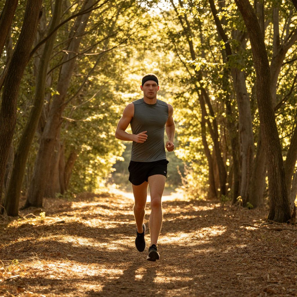 Photograph of a muscular man jogging on a sunlit forest path, wearing a gray tank top, black shorts, and cap, with trees lining both