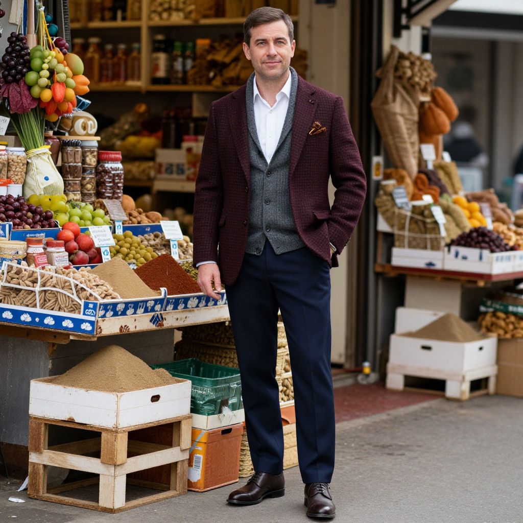Photograph of a Caucasian man with short brown hair and a trimmed beard, standing in front of a fruit and vegetable market. He wears a dark brown tweed blazer over a white shirt and grey vest, paired with dark trousers and black shoes. The market stall behind him is filled with colorful fruits, jars, and baskets, including grapes, apples, and spices. The background features shelves stocked with various goods and a partially open door. The man stands confidently with one hand in his pocket, exuding a sophisticated and stylish appearance.