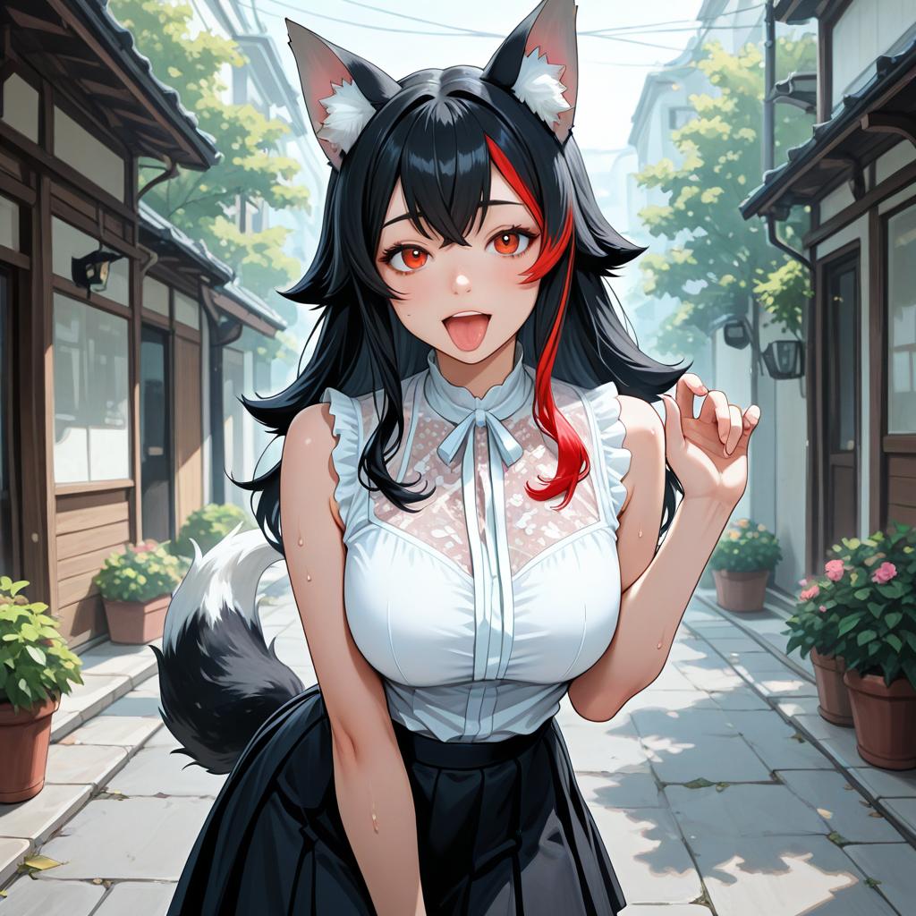 Anime-style female character with black and red hair, cat ears, and a fluffy tail standing on a traditional Japanese street. She is wearing a sleeveless white top with lace and a black skirt, smiling with her tongue out. The background features wooden buildings, potted plants, and green foliage, reflecting a bright daytime scene.