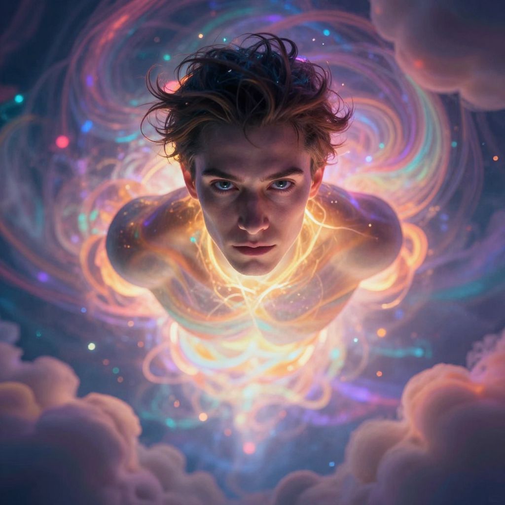 Digital artwork of a young man with tousled brown hair and intense blue eyes, floating in a swirling, colorful vortex. He is surrounded by vibrant, glowing light with hues of purple, orange, and blue, creating a celestial atmosphere. His upper body is illuminated by a bright, central light, with his face looking directly at the viewer. The background features soft, fluffy clouds at the bottom, giving the impression that he is descending from the sky. The overall style is surreal and dreamlike, with a focus on dynamic lighting and vibrant colors.