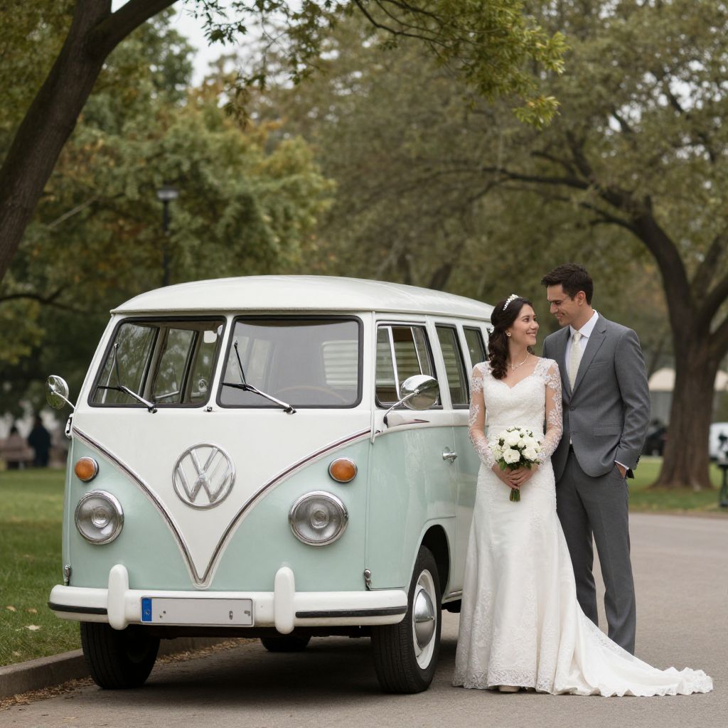 Classic VW Bus parked gracefully in a serene park setting, featuring a smiling couple dressed in wedding attire, exuding vintage charm and timeless elegance.