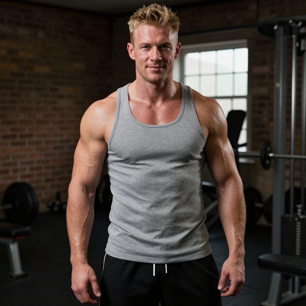 Photograph of a muscular, blonde-haired man standing in a dimly lit gym. He's wearing a gray tank top that shows off his defined biceps and a hint of sweat, and black workout pants. He has a slight smile and is looking directly at the camera. The background includes brick walls, a window letting in daylight, and gym equipment. The lighting highlights his toned arms and chest.