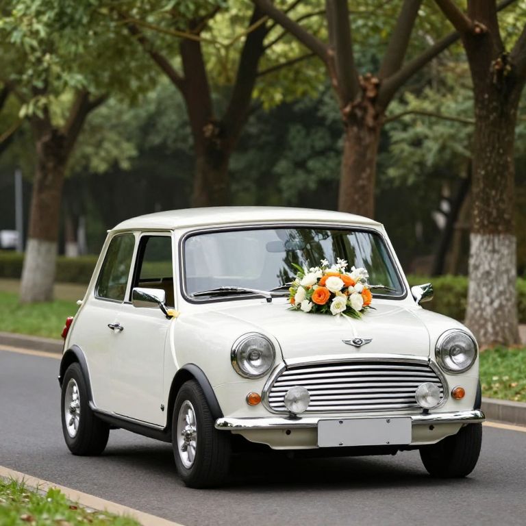 Photograph of a white classic Mini Cooper driving on a paved road, adorned with a bouquet of orange, yellow, and white flowers on the hood. The car has chrome accents, round headlights, and a license plate at the front. The background features a tree-lined park with green foliage and a dark building. The car's windows are slightly tinted, and the road has yellow lane markings. The overall scene exudes a vintage charm with a touch of celebration, suggested by the flower arrangement.