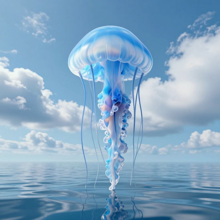 A surreal 3D-rendered scene depicts a colossal jellyfish with a translucent blue body and ethereal tentacles, drifting serenely across a tranquil ocean surface that mirrors the sky above, where gravity-defying clouds form a mesmerizing, dreamlike horizon.