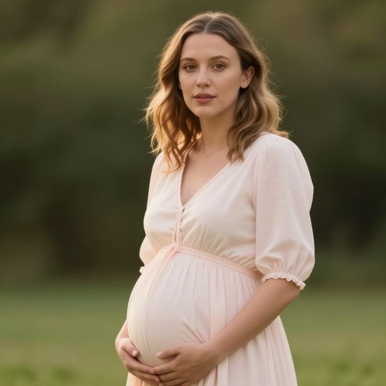 Millie Bobby Brown pregnancy photoshoot, soft natural lighting, serene outdoor setting, gentle maternity dress, warm pastel color palette, dreamy and peaceful atmosphere