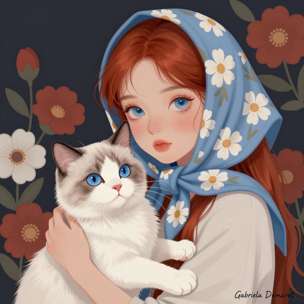 Digital illustration of a young woman with light skin and brown hair wearing a floral-patterned headscarf and matching shawl. She has large eyes, light makeup, and a pink earring. A tabby cat with green eyes and striped fur sits on her shoulder, looking to the side. Dark gray background. The woman has a gentle expression, and the cat's expression is alert. Two people, woman and cat. Woman's head slightly turned, cat's head facing forward.